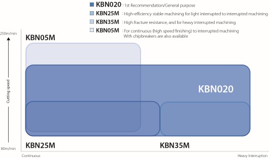 interrupted machining. KBN020 covers a wide range of applications from continuous to interruped machining of hardened material.
